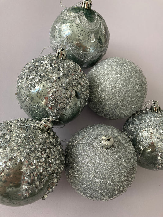 6Pck Silver Mixed Design Christmas Baubles