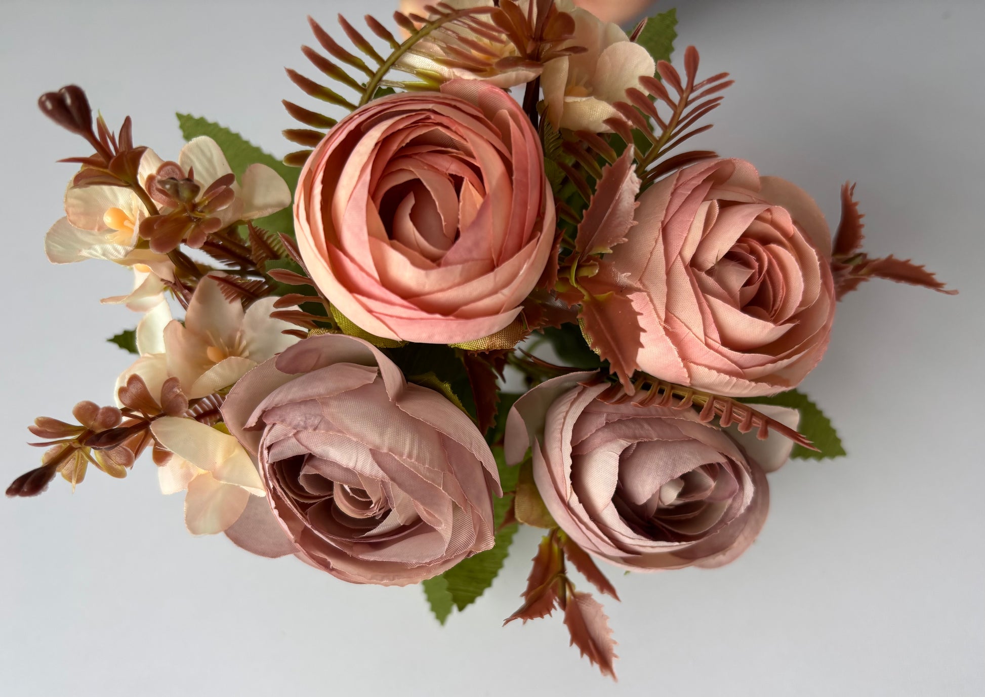 Dusky Pink & Purple artificial Ranunculi & Hydrangea floral bunch.