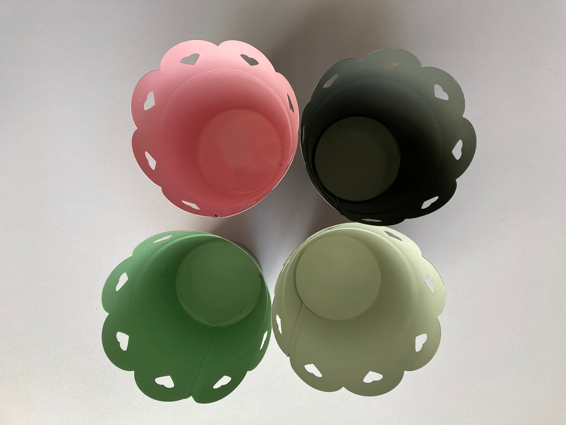 Green metal planter pot with heart design detail.