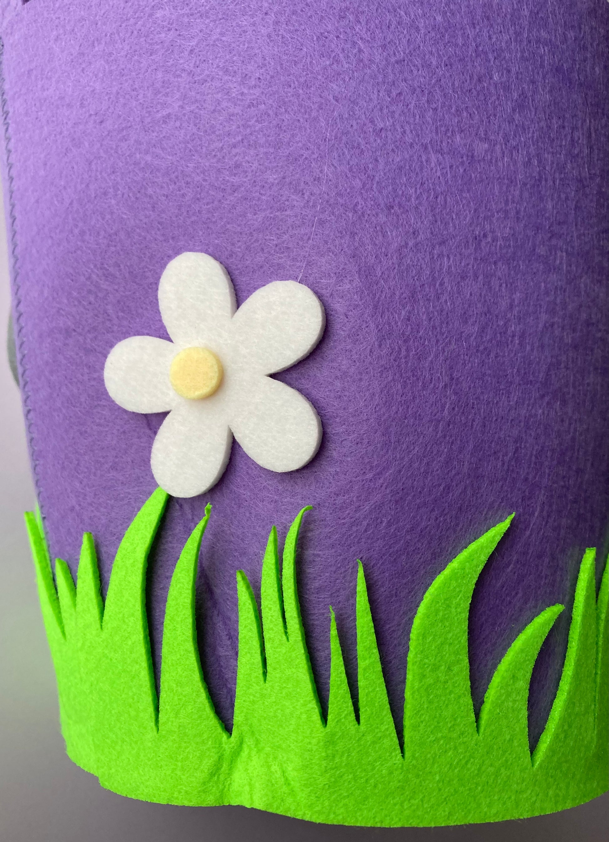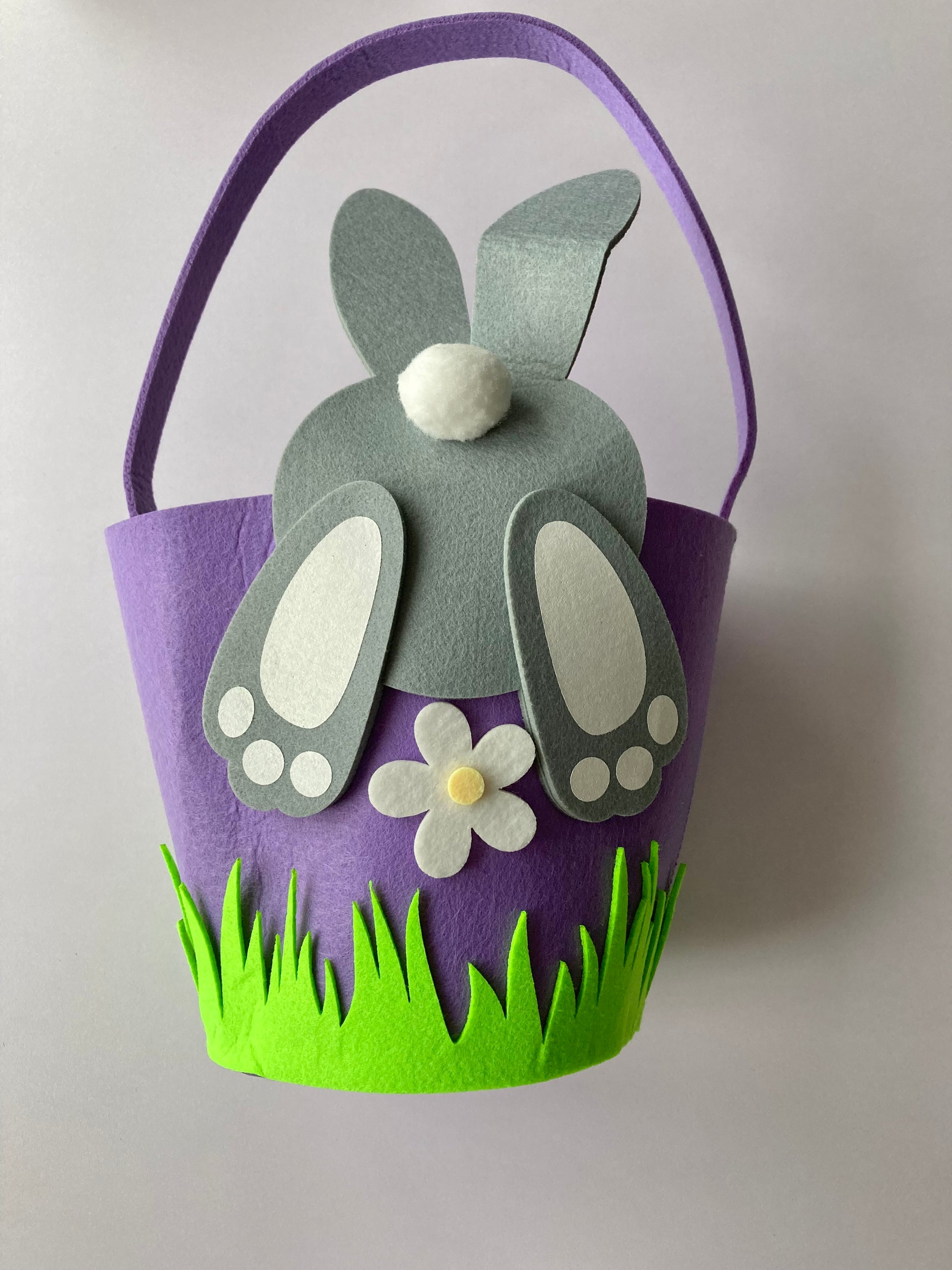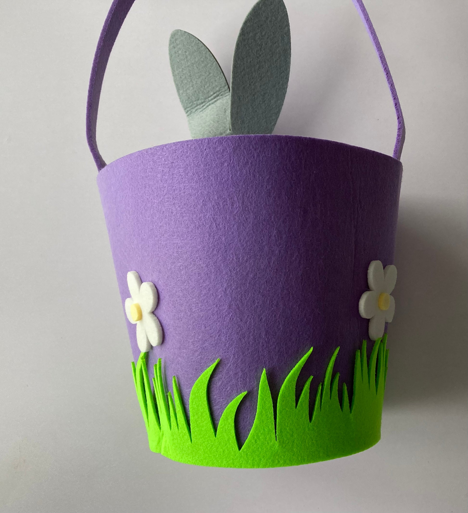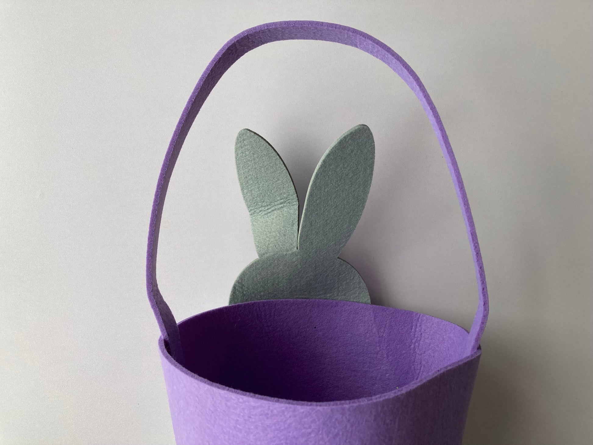Pastel purple and bright green thick felt fun childrens easter egg hunt basket with bunny ears, feet and pom pom tail.