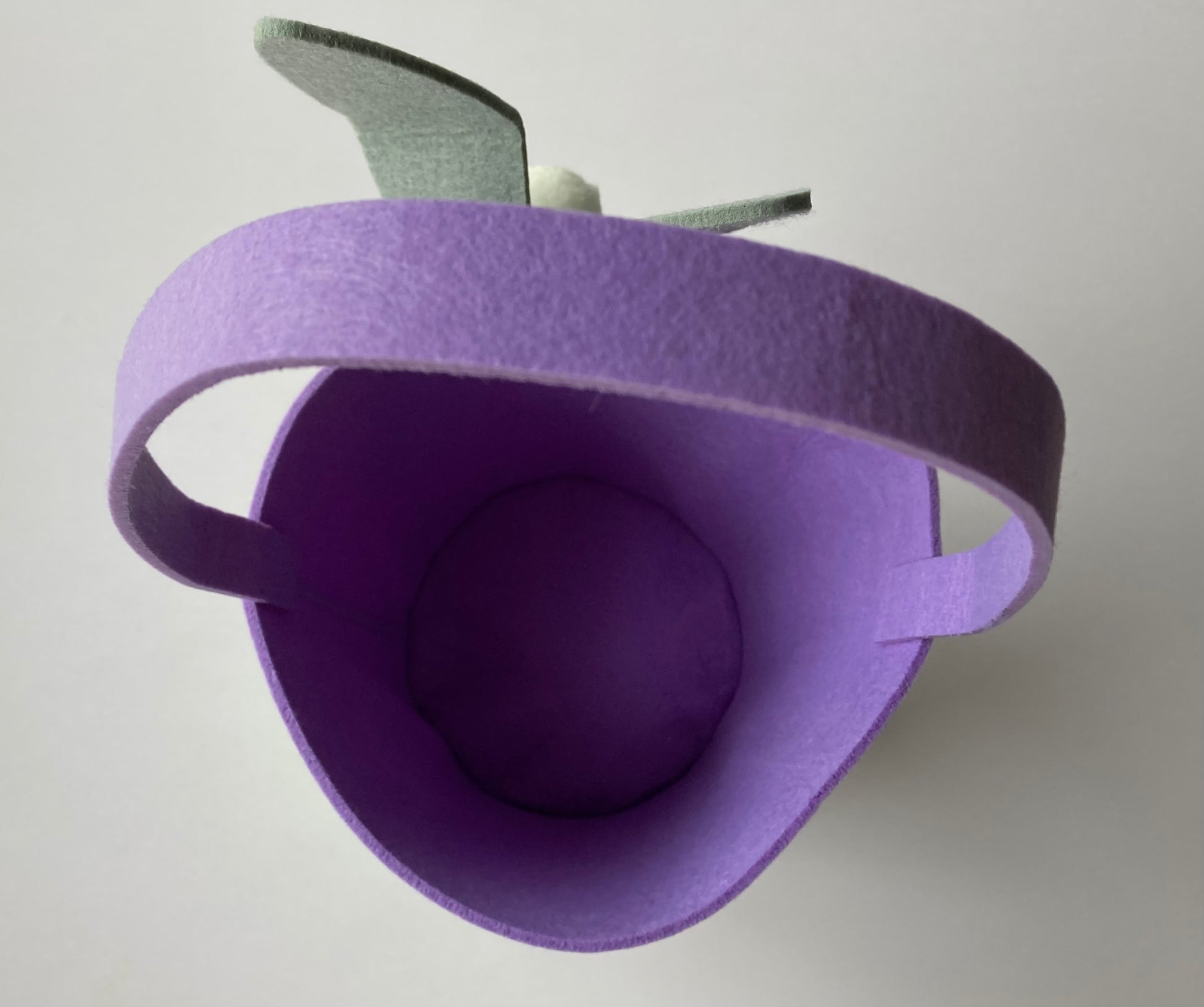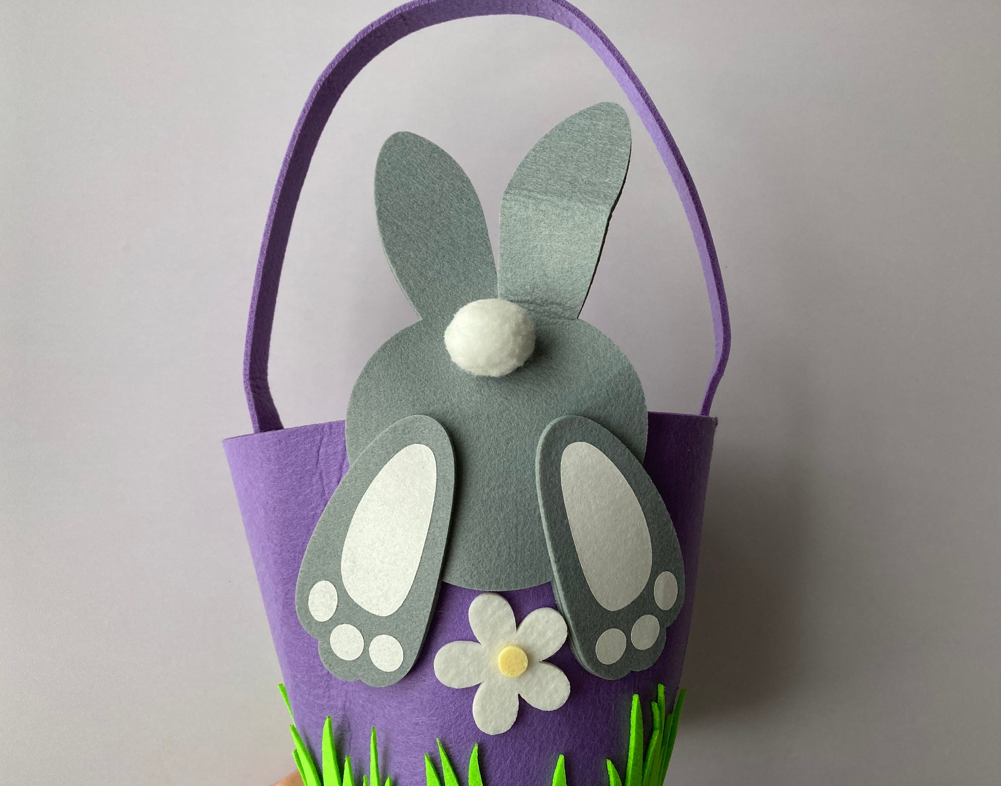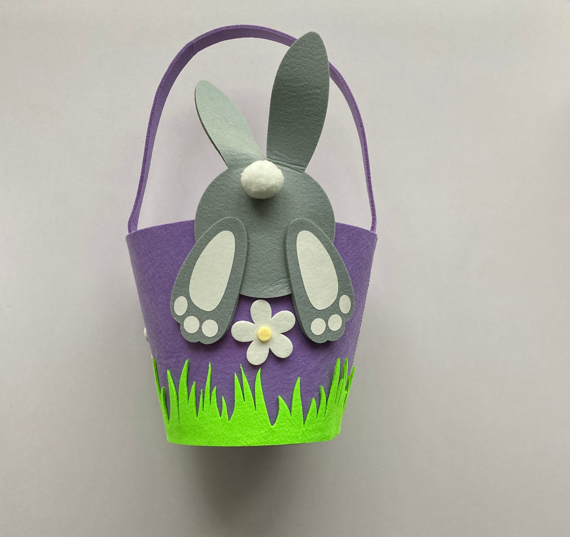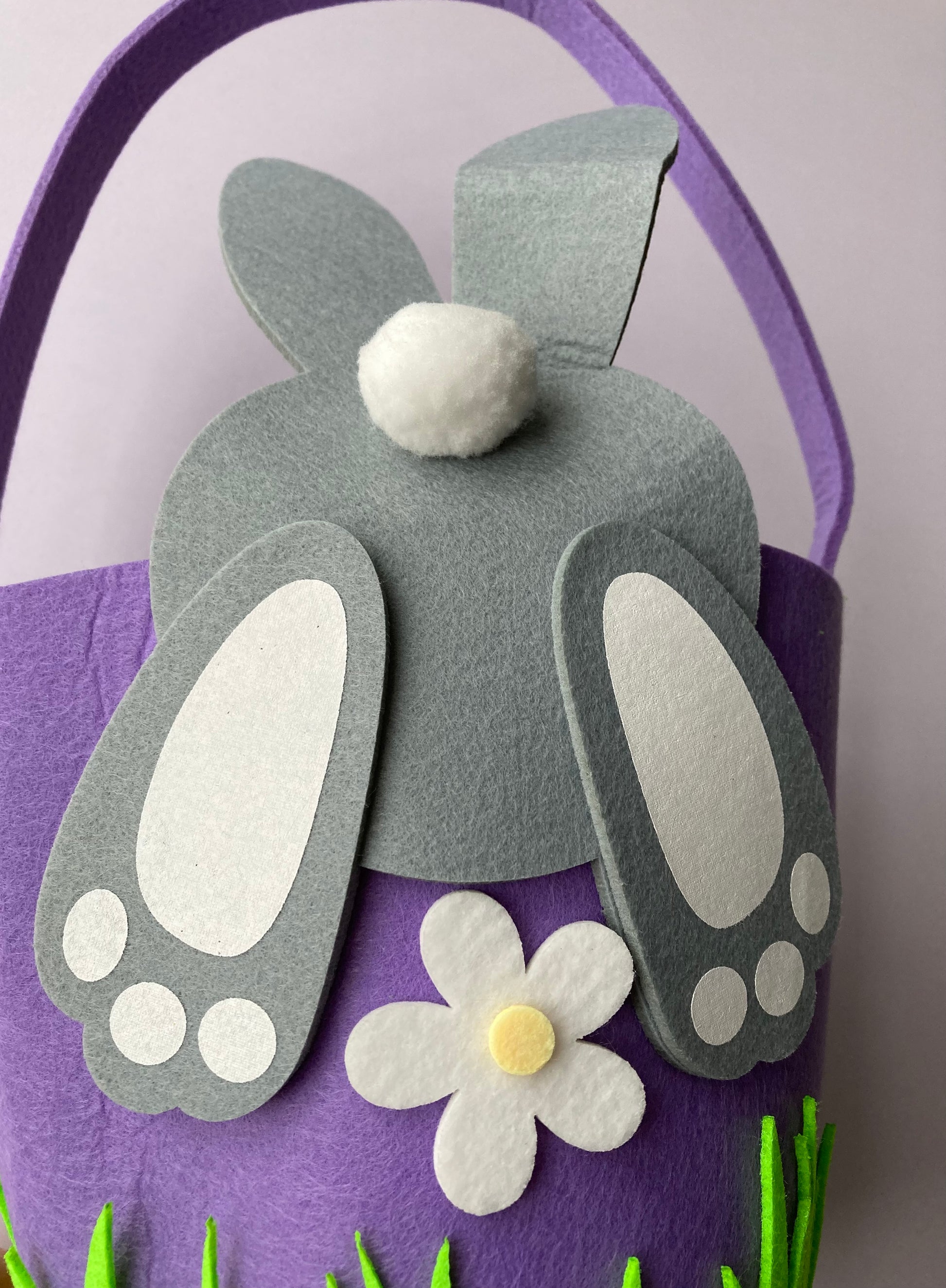 Pastel purple and bright green thick felt fun childrens easter egg hunt basket with bunny ears, feet and pom pom tail.