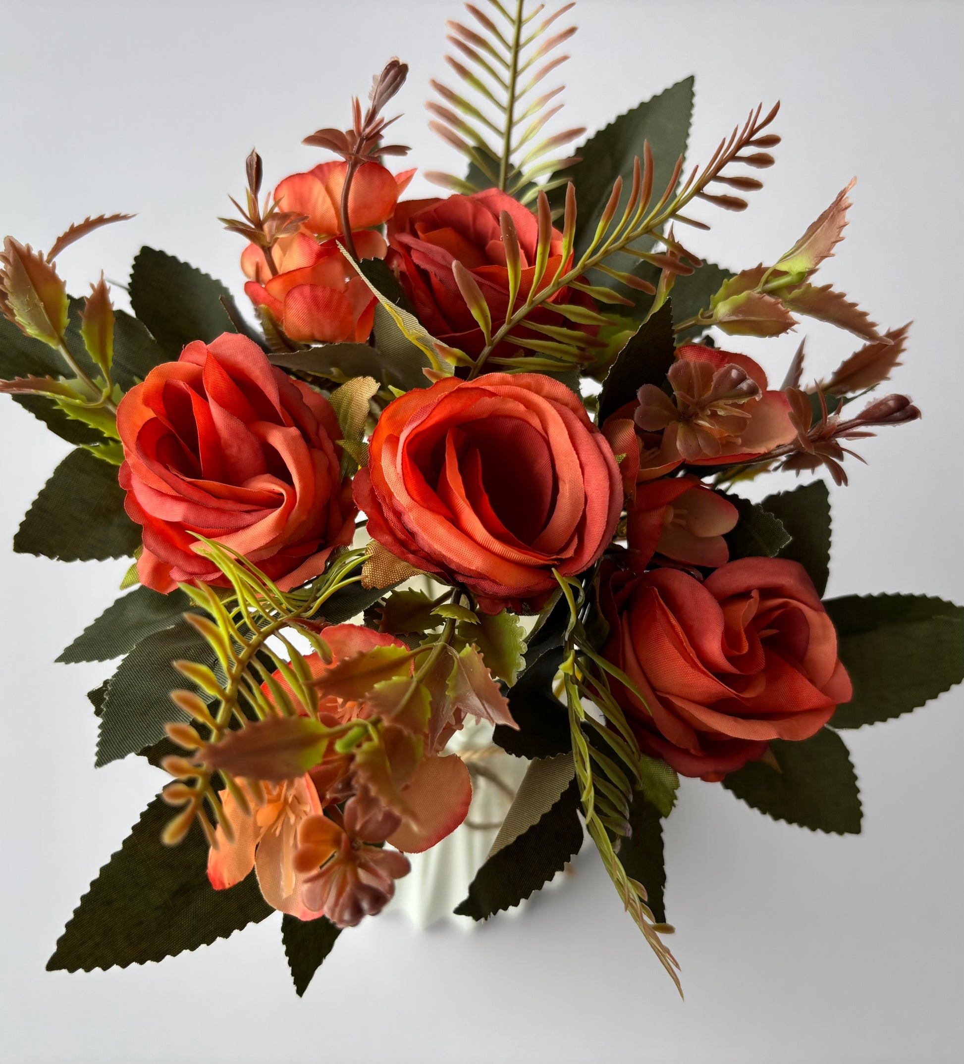 Terracotta/Red/Orange artificial floral autumn Rosebud & Hydrangea Autumn bunch.